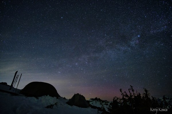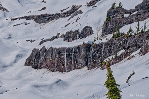 Thanks to Carl Marrs for this amazing photo of the upper 2/3 of our 7500ft (!) ski descent, and Kenji Kawai for the real artist photos (labeled with his name).