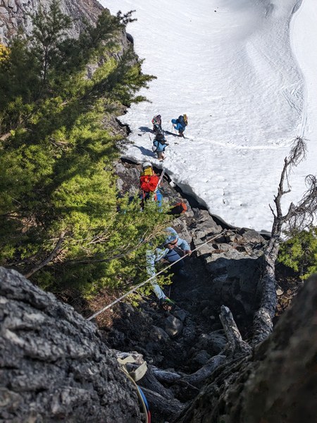 The difficulties ended after the first 1.5 miles and we were able to start skinning at mile 2 of the trail. The scramble up to Boulder Ridge was straightforward, and a solid looking hand line was in place.