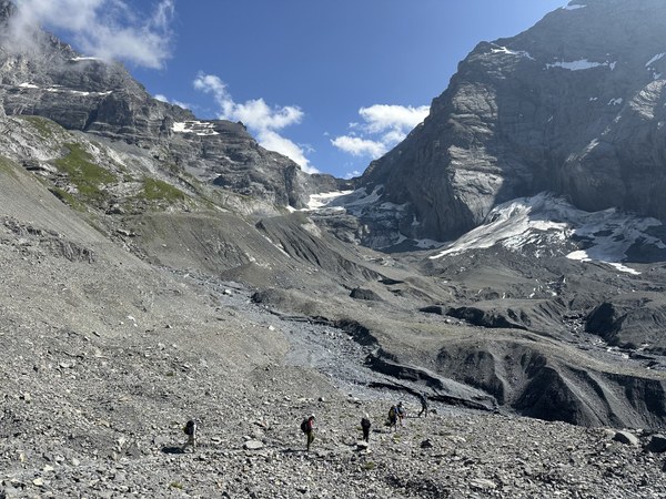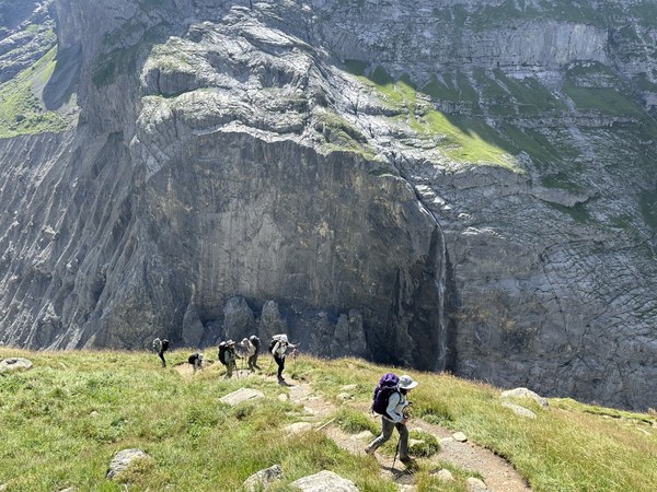 After three days of clouds and rain, we were thrilled to wake up to clear, sunny skies. It was time to trade the relative hustle and bustle of Mürren for the remote, rugged, absolutely gorgeous head of the Lauterbrunnen Valley. From Mürren, we descended to Gimmelwald, the small mountainside village that triggered the trip leader's obsession with the Jungfrau region over a decade ago. We continued past Gimmelwald to the valley floor and then trekked alongside Weisse Lütschine, eventually entering the UNESCO World Heritage site. We explored the head of the Lauterbrunnen Valley clockwise, hiking up rock, through meadows, and above waterfalls. The mountains and glaciers at the head of the valley loomed larger with every step.