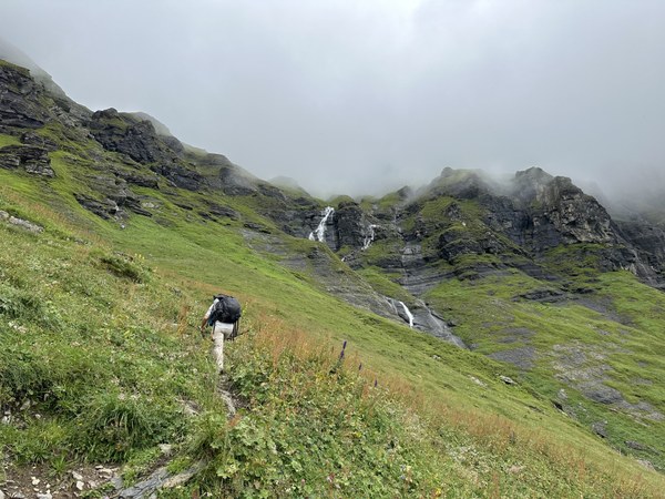 We didn't need any more motivation, but the weather forecast provided it: thunderstorms arriving at 1:30pm. On a day where we're ascending well above treeline. So we remained focused, tried to be efficient with our breaks and our photo stops, and basically hauled ass. Ascending the steep slopes of the gorge carved out by the Upper Grindelwald glacier, we passed through meadows, squeezed behind waterfalls, and admired the hanging glaciers above us. All while keeping our eyes on the clouds.