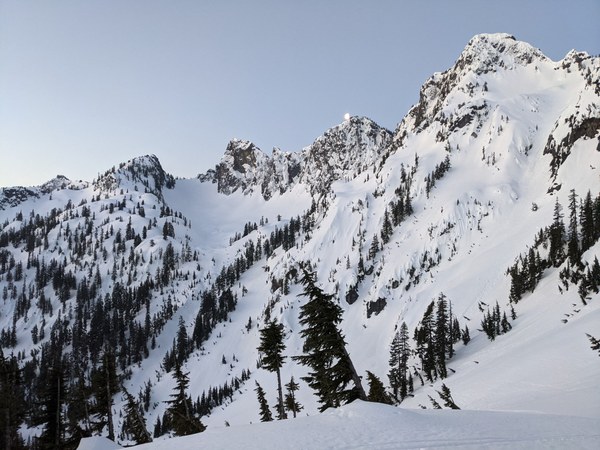 Fortunately, we had the last opportunity to do it before the winter was over, with Friday looking not perfect, but reasonable. With a dry mid-week and a warm Wednesday, snow had the chance to settle somewhat. We expected and saw a "low" avy risk rating from NWAC at climbing elevations. Wind in the 10-15mph range, expected temperatures 27-28F overnight and throughout the day, and partially cloudy skies. We decided that this was looking promising enough to give it a shot, and go to see Chair Peak up close. The conditioning benefit would still be there, and the only downside was a little less sleep (you definitely want to do this climb as early in the day as is humanely possible).