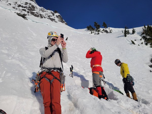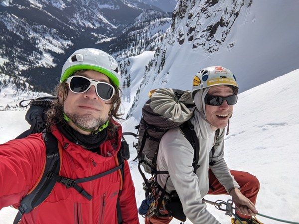 As an extra curveball thrown by the universe, as I was downclimbing from the second rappel and looking for a way to negotiate the crown, I witnessed a large slide over the neighboring wall, which came in two waves, and was rather terrifying. We were not exactly sure what might have caused it, or where it came from. Avy risk at this elevation was forecasted "low" by NWAC, temps consistently forecasted below-freezing during the day for a dew days in a row. The slide did not come from a gully, as there wasn't one for it to come from, and we couldn't see a failed cornice.