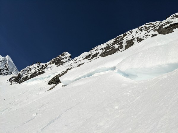 Later, before departing, we saw a couple of large rocks falling down from the top on the eastern face (without causing any further damage), and the face seemed to have less snow on it than what we remembered on the way up. We concluded that what likely happened is either rock, or snow release from the top in turn unleashed the snow on the face, causing a larger section of it to go down at once. Alternatively, this could have been caused a failed chunk of cornice that couldn't be immediately seen from where we were standing.