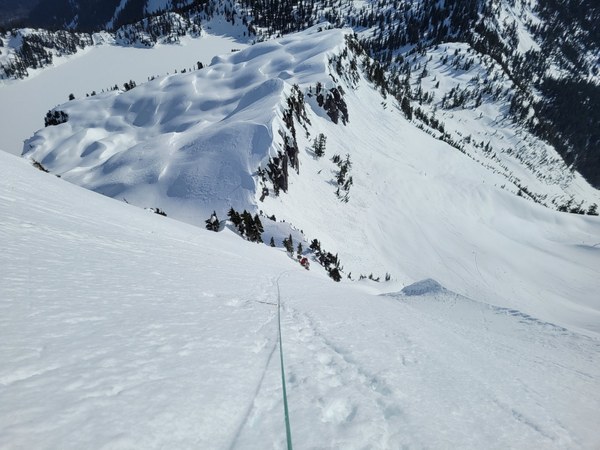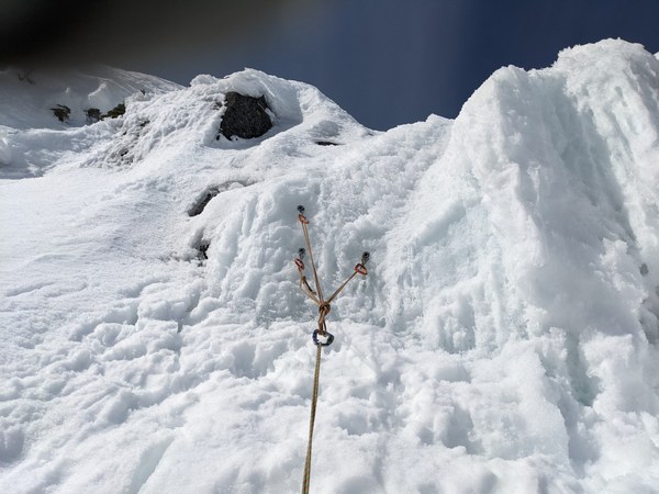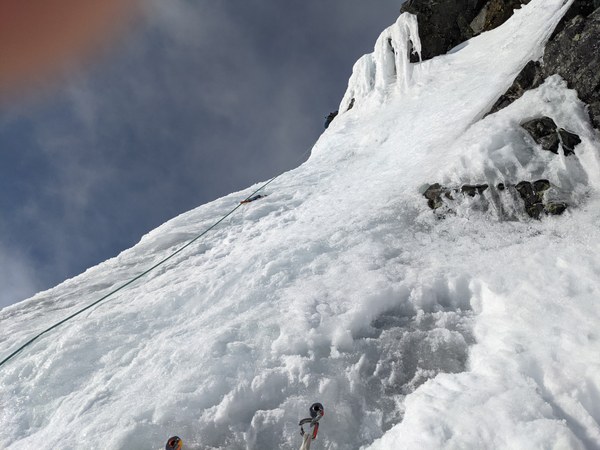 Protection during the simul-pitch was pickets-only, as there was no rock to be found along the way except far off to the side, which was definitely not great, but as noted above, that part was really very short. Unlike snow on the approach, the snow on the simul-pitch and higher up was relatively heavy and grabby, and packed pretty well, so good steps were made that enabled for a relatively secure travel. Overall, nothing remarkable to say about this pitch.