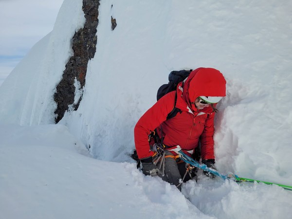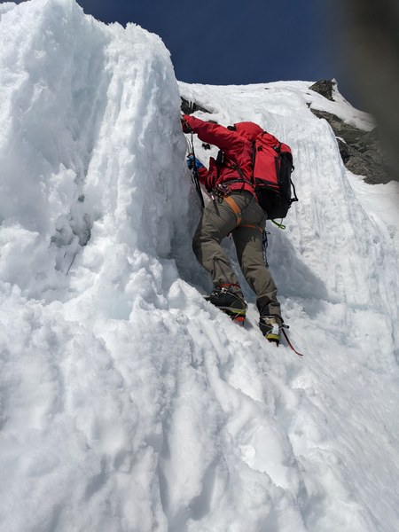 Contrary to what the forecast promised, the skies were clear throughout that day, so as much as it was fun being on the summit, and despite topping out slightly ahead of schedule, we did not want to spend any longer up there than necessary, as the sun meant the snow softening up and the potential dangers lurking on the descent. Getting to the rappel was a priority.