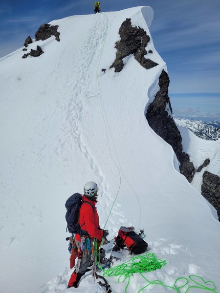 From the false summit, one normally unropes and scrambles to the summit proper, but given the late season conditions and above the gully not being a great place to blow a step and fall while down-climbing, we played it extra safe, and we belayed the very short walk to the summit as well. Some will undoubtedly find it excessive, but if the conditions leave a trace of doubt in mind, and protection is readily available and cheap, why not take it.
