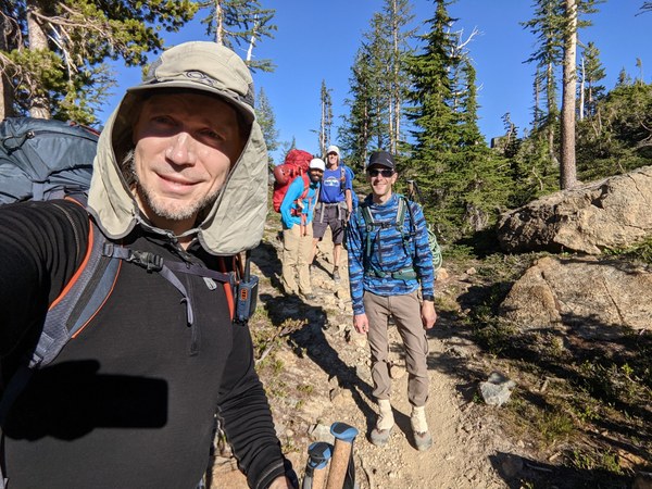Got up on Sunday around sunrise, broke the camp, stashed the camp gear, and started moving at somewhere in the ballpark of 6:20am. Most of us opted to go more streamlined with only small summit packs, which worked well.