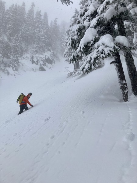For the approach, we were on snow from the Narada Falls parking lot with some variable conditions but predominantly soft snow other than some re-frozen, crusty areas under tree cover. (The tree-bomb snow was refrozen.) The creek was apparent (low spots in the snow) but fully covered in the basin.