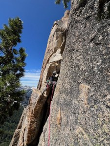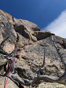 Dima then took off up pitch 2, navigating the chimney pitch (which really feels more like oddly stacked blocks and a flaring crack than a chimney). She made the second anchor on a nice flat area with a dead but solid tree, backed up with two cams. I followed up the pitch. When seeing pitch 3, she was interested in leading it as well. I helped her see which way the route went and again Dima took off uphill, placing gear and clipping the fixed piton.