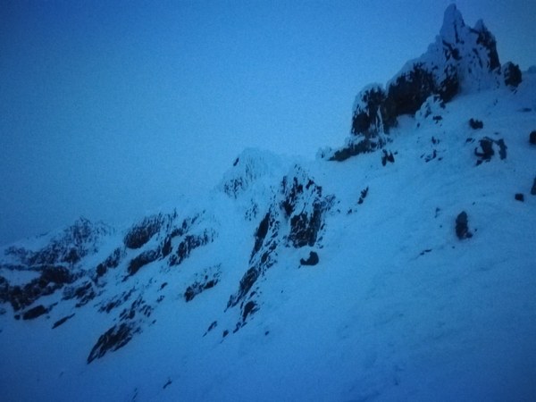 We didn't stay too long due to the winds. By then the sun was out and the snow softening, but the downclimb through the Pearly Gates was the worst part of it all. We took a break afterwards and got some good views of the Devil's Kitchen Headwall.
