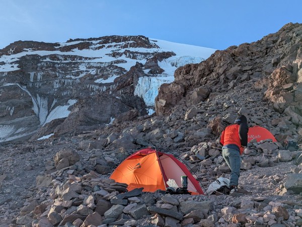 We decided to camp at 11,219' (46.8343472,-121.7629389), on an existing tent pad with a rock ring. The sites here are the last ones before descending the rock step. There are a few other rock rings around here as well as 20 feet below. The original site of Camp Hazard is higher up at around 11,400' ft. There are some flat spots here but it is in the line of rock and icefall and best avoided if there are sites lower down.
