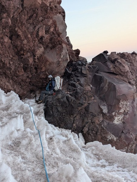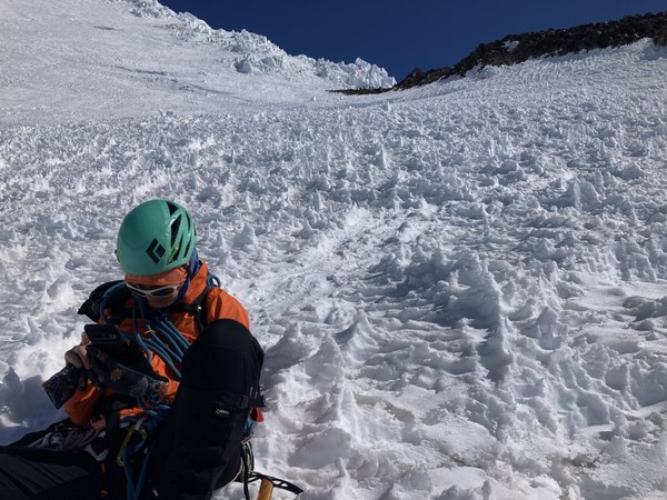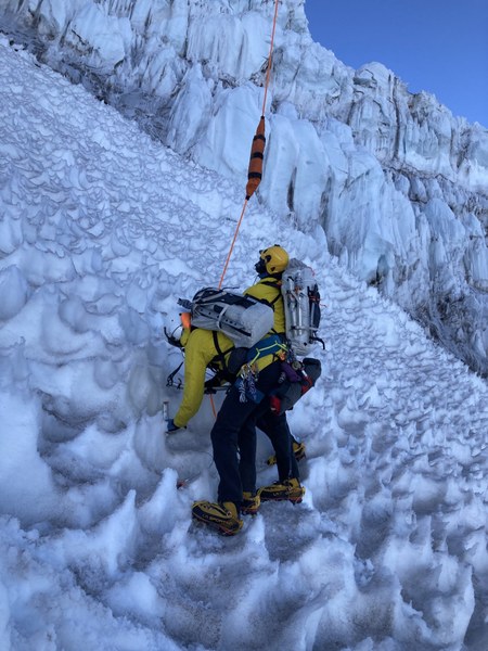 As we descended down from Wapowety cleaver toward the top of the second ice pitch, Jule's breathing was becoming more labored, the opposite of what we were expecting given how descending was less strenuous than ascending, and that we were below 12,000' at this point. After careful consideration, we made the call to hit SOS on our InReach and notify emergency services of the situation. The group ahead of us graciously let us rappel off their double 70m ropes to the bottom of the second ice pitch, where we took a few more steps with the intent to continue to the next rappel and wait for assistance at camp. We reached 11,800' where Jule could not continue walking down so we sat down and continued messaging with emergency services. We had brought a sleeping pad, sleeping bag, and extra clothes with us so we hunkered down and waited.