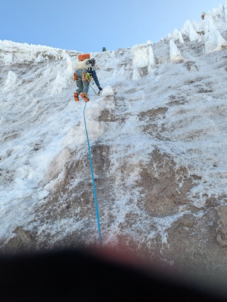 Trickles of silty water available on route between Camp Hazard and Wapowety cleaver from melting penitentes. Ice pitches were AI2 at most. A few good sticks but mostly rotten snow and frozen dirt. Good screw placements required cleaning off some of the rotten stuff first. Climbing length was about 2 full 60m pitches + a little simuling and then a long snow slog to the summit, crossing some cracks and passing over snow bridges. Once snow bridges melt, more zig zagging will be needed to end run crevasses. Penitentes all over the ice chute made for nice rest spots. 2 70m double rope rappels make it back down to the snow and walk over to the rock step and back to camp.