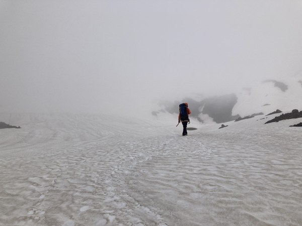 With our permit in hand we made our way to the Glacier Vista trail and crossed the Nisqually and Wilson glaciers. Some cracks are starting to snow but just barely. We were in a thick fog for most of the approach so we relied heavily on GPS for navigation.