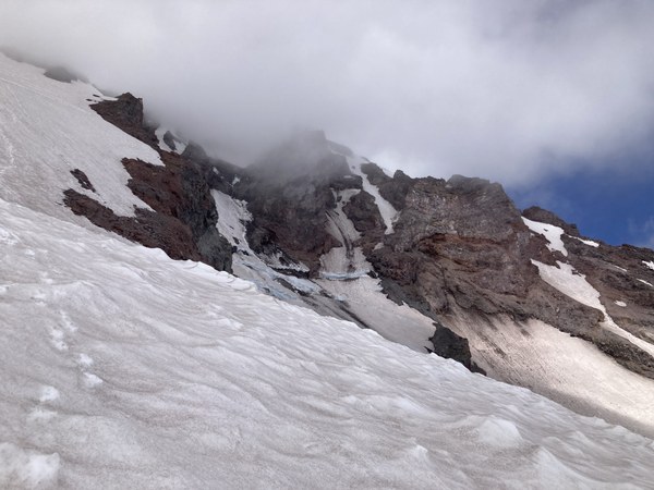 As we approached the Turtle snowfield at ~9700' feet the clouds started to part and we could see glimpses of blue sky.