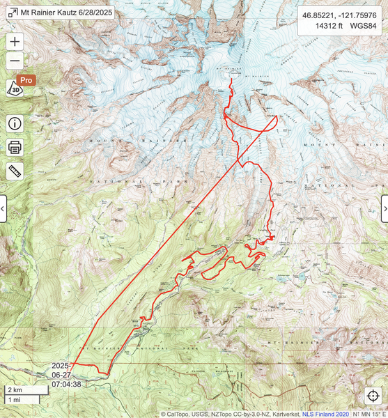 Two-day climb of the Kautz Route on Mt Rainier with an overnight at Camp Hazard, featuring straightforward ice pitches (AI2) and lots of penitentes. The descent was interrupted due to a medical emergency, leading to a helicopter rescue at 11,800' — huge thanks to the rangers and fellow climbers who helped along the way.