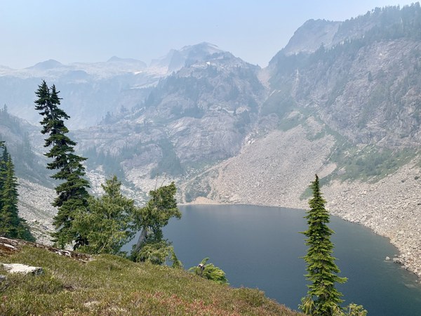 We secured a walk-up permit on Saturday morning and began our approach at 9a on Saturday. We arrived at lower Thornton Lake around noon and encountered a large black bear on the log jam at the outlet to the lake. We yelled to scare the bear off, and continued up and around the lake on a trail that is overgrown and hard to follow at times.