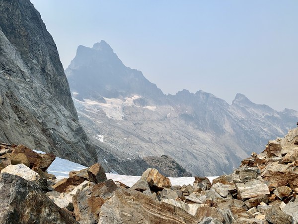 We continued down the snow patch on the other side of the col (200ft decent) without issue having brought mountaineering boots, crampons, and ice axes for this section. Some of the party decided to use crampons and ice axes because we brought them, but if doing this route again in similar conditions, I would have saved weight and left the snow gear home.