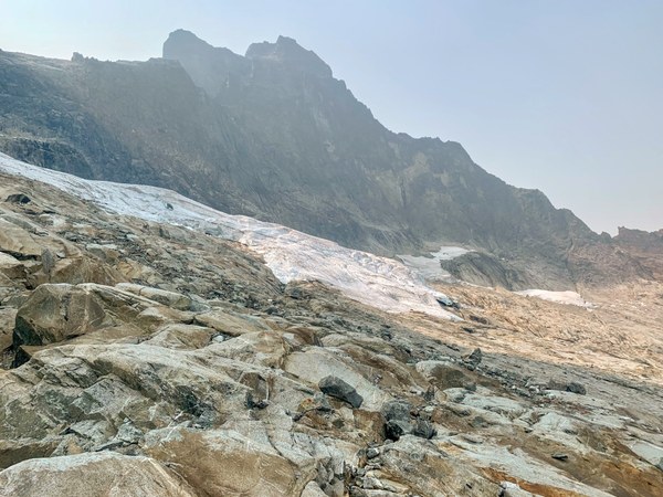 The slabs below the glacier were mostly free of snow, with one steep section that required downclimbing. We filled water from the streams running down the slabs before reaching the ridge.