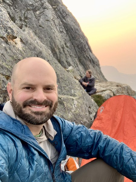 We cached our glacier gear below the NE ridge and headed up towards the prominent notch on the ridge. We trended climbers left before reaching the notch proper and racked up at this point. We climbed ~3 pitches along the ridge to a large ledge where we set up camp for the night.