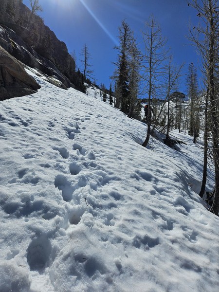 Alex and I arrived at the Blue Lake Trailhead a little later than planned around 8:30 AM, but quickly got out on the trail. The trail had patchy snow with some longer dry sections off and on until the turn for the climbers trail. Soon after there was nearly consistent snow all the way to SEWS. The sun exposed snow was soft and we found ourselves post-holing unexpectedly from time to time, especially where water was undercutting the snow. Once we reached the shade the snow firmed up.
