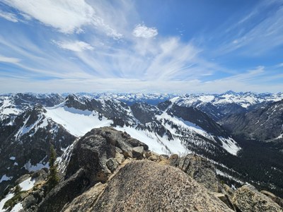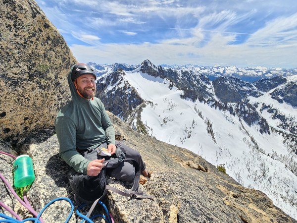 The climbing route was in good condition but had several snow patches, one in the sandy gully after pitch 8 and on the summit. There is still a significant amount of snow in the area around SEWS and on the Blue Lake Trail, staying consistent soon after where the climbers trail forks off from the Blue Lake Trail.