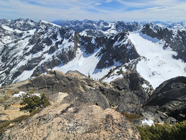 We took some photos, ate a quick bite, and then proceeded to downclimb the South Arete route. We did have to walk through several patches of snow on the way down, but for the most part it was avoidable. As we descended we saw a huge line of at least 6 to 7 parties on the Southwest Rib which is not surprising for it being a nice Saturday. After 3 rappels we reached the base of the South Arete route, just catching up with the party we saw heading towards that route earlier in the day. There was a significant amount of snow still at the base so we slowly plunge stepped in our climbing shoes back to our stashed gear. We reached our backpacks around 4 PM.