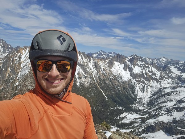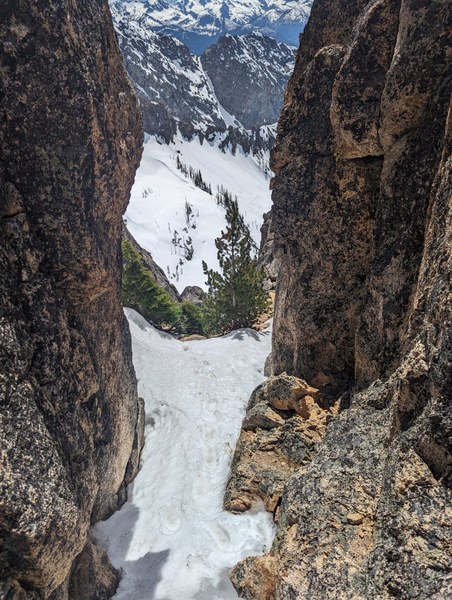 We swapped leads, following up a 5.9 variation, and eventually made it up to the base of the bear hug pitch in good time. We caught up to the first party and they generously let us pass them and we headed up the bear hug pitch and continued to swap leads. We decided to rappel into the gully which still was full of snow, making for some cold, snowy kick steps. We quickly gained the summit around 2:30 PM, mostly being able to avoid the snow that remained on top.