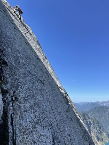 I brought doubles of .2- 1 and one #2 and #3 and no nuts. I did not use the #3. There were lots of good placements. Rock quality was good with few loose rocks. The first pitch felt very short and we accidentally linked pitches 1 and 2 which barely worked with a 70m rope and caused some rope drag. I felt the route was technically easy, but the exposure and awesome views kept it interesting. This route was extremely popular and even arriving in the afternoon we encountered a line up at the base. I also encountered climbers who arrived the night before and camped at the lake ready for an early start- I recommend doing this or climbing it during the week.