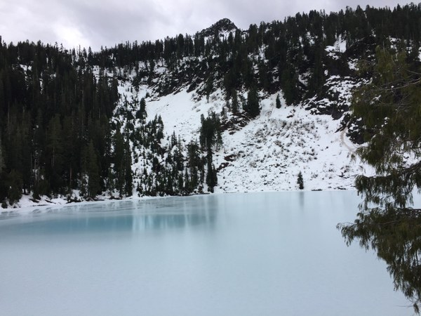 For a day which was to be rainy we managed to avoid the rain until about 20 minutes before returning to the cars. The snowline which fairly high so we were able to drive up the road for 1.7 miles before being stopped by the snow. From there we walked the road until it got a little slippery the put on the micro spikes which we used all the way to the lake. Interestingly the lake had standing water with ice under it. After an enjoyable lunch at the lake with did a little wandering at the lake and then headed down. When we reached the road we decide to follow the road/trail which required using our snowshoes. As the trail had been abandon we ended up doing some brush bashing in the woods before giving up and returning to the road. Some picture below: