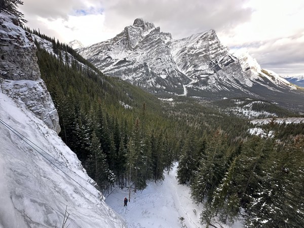 For the third and final day, we were struggling to find a suitable venue for the the spectrum of abilities we had in the group. There was discussion about splitting up and heading to different locations, concerns about popular venues being crowded or us being in the "danger zone" of climbers above while we were working on skills. After quite a bit of deliberation, I saw on Will Gadd's "Ice and Mixed Climbing" app the Wedge Smear area, and I remembered that Andy had mentioned this as well as a good classroom venue. With climbs ranging from WI2 to harder mixed lines that were accessible by top-rope, it seemed like a worthy endeavor. After a winding hike along the Kananaskis highway and through the forest, we arrived at the zone. Unfortunately, it was less filled in as what the beta photos showed, but it seemed good enough for our crew. Justin and Sherman were eager to get top-ropes up on the mixed lines, so they hiked up the gulley and around for that. Tim did well in leading a WI2 line to put a rope up that could be used for practice on a slightly steeper section as well. And Jan did a short lead up a WI 2 section as well and did a good job of building an ice anchor.