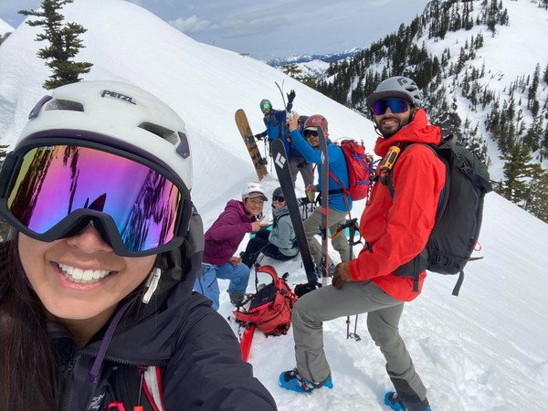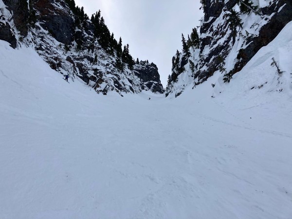 The snow was somewhat soft with a firm layer beneath, and afterwards I gained the confidence I needed to make turns through the widening couloir back down to the base. Julia and Alex followed shortly. Our warmup was done.