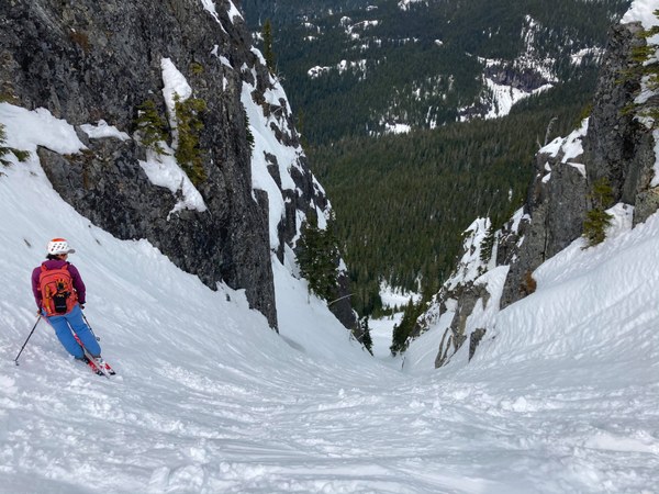 At the top as we set up to descent the parties before us ripped down like professionals on an Olympic halfpipe. Sometimes watching people ski is just a sight to behold. Looking down the couloir though it was pretty intimidating. The very top was quite narrow, and I knew I'd have to sideslip part of the way down.