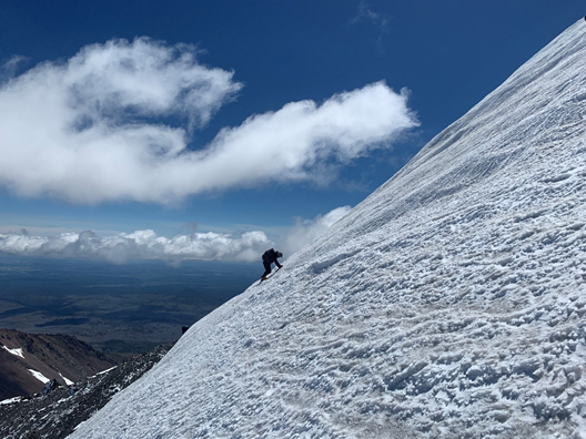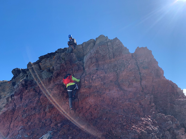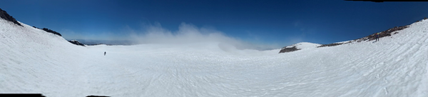 Skirting the edge of the Lewis Glacier we climbed over the South Ridge and joined the South Route for the last 1300 feet of the climb to the summit. This is a very straightforward climber’s trail that zig-zags up the ridge on loose scree. On the way up we took the most direct way up to the East rim of the crater. On the way back we traversed the crater and descended a little more to the west. Either way is fine but most people take the more western trail and traverse the crater.