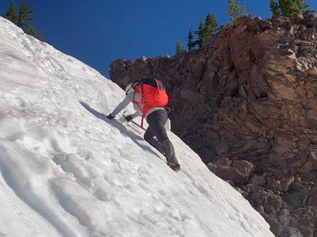 After carefully re-descending the ledges, the rappelled the rock band and retraced our route back to our stashed gear. Then wearing crampons and ice axes we descended a steep but short snow slope to the north of the ridge to begin our long traverse below and around Broken Top to join the caldera rim and eventually the Tam McArthur Rim Trail.