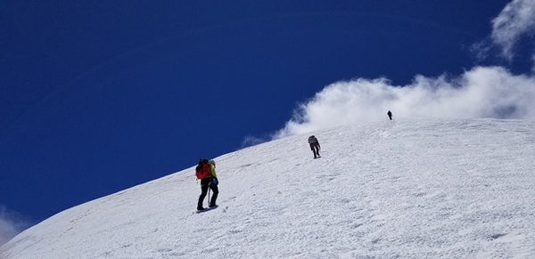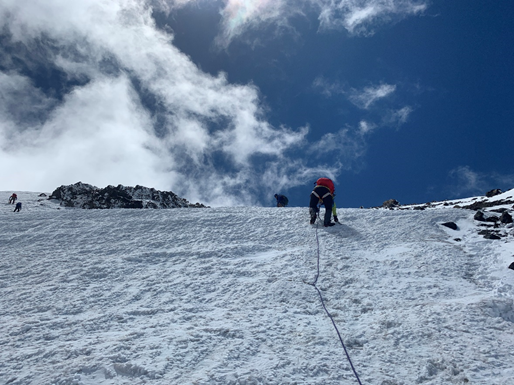 From the saddle, the route to the summit includes some easy scrambling on the ridge followed by a couple of steep (one 50 degrees, one 45) pitches of snow to the summit. The snow was very icy and given the lack of ice-climbing experience of one of the participants and the very bad run-out, we decided to protect it with pickets and do one running belay on each of the steeper sections. Pickets went in very well and this was a great introductory experience to alpine ice for Christine.