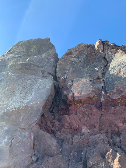 The ledges above are very exposed and have loose scree on them and are un-protectable so we carefully step along them to reach a platform that jets out of the real summit block towards the false summit of Broken Top. This has a very thin catwalk (less than 1 foot wide) and then the final block is a class 3 scramble to the tippy top of Broken Top. Exposure is real but this part if not very hard at all.