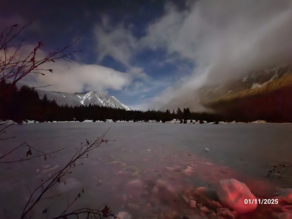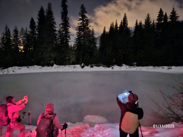 Easy snowshoe trip with bright moonlight. Included Gold Creek Pond & Heli's Pond.