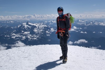 ON TOP! We gave each other high fives and unroped for some pictures on the summit. Ellen had CRUSHED IT! Her first glaciated climb…what a step up! We roped back up and began the long slog back down the hill. The snow was just beginning to become mushy and sloppy, so we were glad to be heading back down.