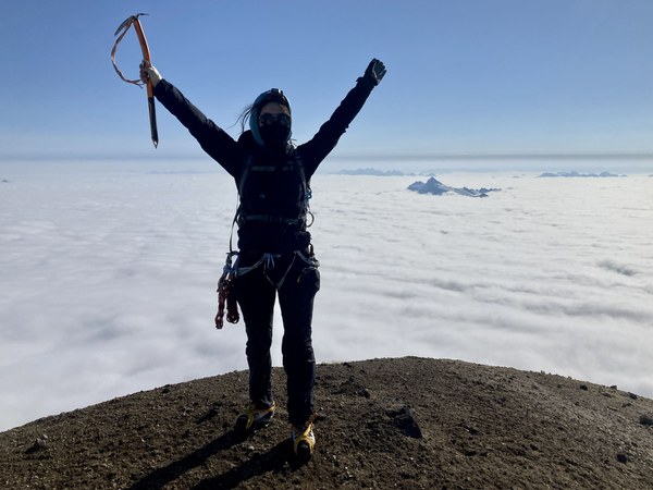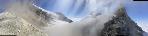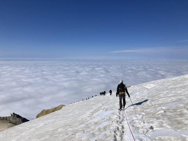 8:45am Reached summit. Took some photos with the group. Big cloud layer below us, could see only the tips of peaks sticking out of the clouds. Blue skies above us. Quite windy but not too cold. Descended back down to the flat spot below the summit hill for a snack break.