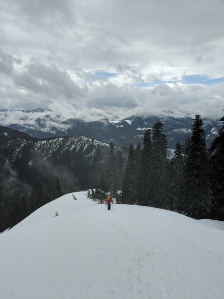 We met up at Issaquah transit for a leisurely 7:15 start and reached the spot where we left our cars at approx. 8:30. After a half mile road walk to the official trailhead we set off at 9:10am. We were able to follow the summer trail for a good two miles in a cleansing (soaking) rain up to the first ridge before it was covered in snow at around 3200'. We achieved full drowned-rat appearance at that point, found the geocache and then proceeded in a leisurely fashion to head through the woods practicing snow skills for those who were students. We checked in regularly as the avalanche danger was listed as considerable but agreed that it seemed like we were okay on the ridge with the low amount of snow coverage. We began to dry out as the rain ceased and arrived up at Para point at 12:45pm. We took a short lunch break and put on our snowshoes as to address postholing before setting off again. The sun poked through with a few patches of blue sky as we traversed the ridge, arriving at the true summit at 2:30pm. After a half hour of relaxing, photos and watching the view appear and disappear with the moving clouds we headed back down through variable snow hail and rain. We reached Para point at 3:45pm and were back at the cars around 6:00.