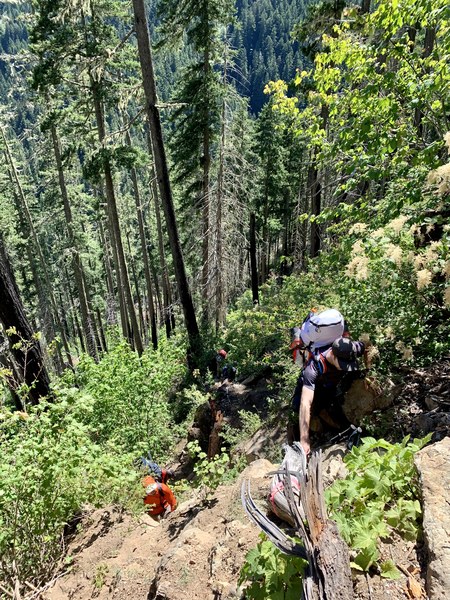 We started climbing at 6a and arrived at the Finger Traverse (~7400 ft) at about 11a with most of the 2700 ft gained on scree. We protected the Finger Traverse with a hand-line due to exposure. The most difficult move was getting around the corner as balance is a little awkward with a pack. There were plenty of features in the rock that took mountaineering boot edges well. We unroped at a natural break in the traverse around the corner and continued on easier, less exposed terrain to the end of the traverse.