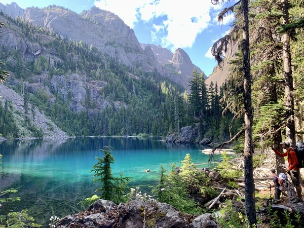 Our team arrived at Dosewallips Rd TH mid-day on Friday and used e-bikes to ferry packs up to the Lake Constance TH. The hike to Lake Constance is steep and involves navigating many blown down trees and several sections of scrambling. The trail can be difficult to find in places and we used a gps track to stay on the trail. Constance Creek was dried up on the lower half of the approach to the lake, but was flowing well in the upper section. There were plenty of good camp sites at Lake Constance on the North side of the lake, including a composting toilet, and bear wires (overnight permits required - secured via recreation.gov). We chose campsite 6 which had enough space for 4 tents and a bivy and easy access to the lake for water.