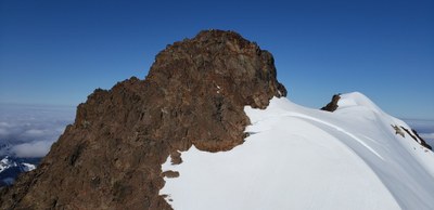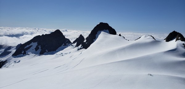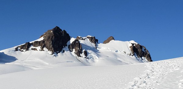 Next time would either do this in 2 days or 3 and in June. The bergshrund is new and wasn't in any of the other reports I viewed previously. That or be prepared to scramble up and down loose class 4. Or tag the middle peak which is 10 ft lower than the west.