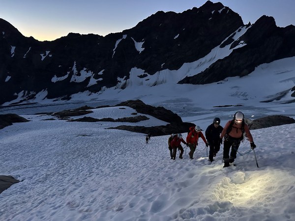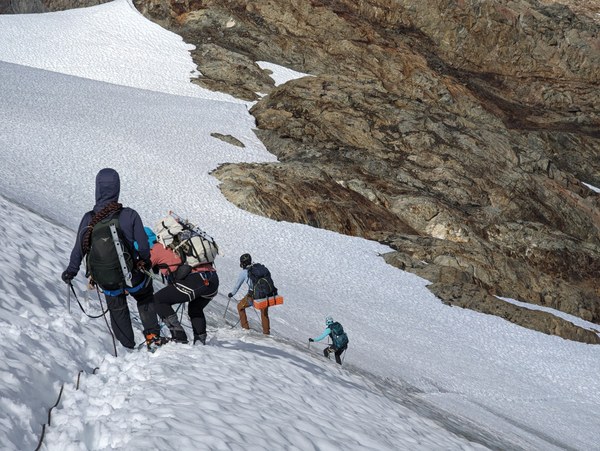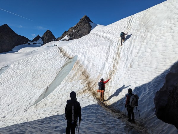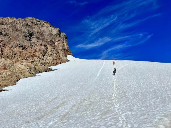 - Rope up to cross the Blue Glacier. Unrope when you reach the rocks at 5,700ft.