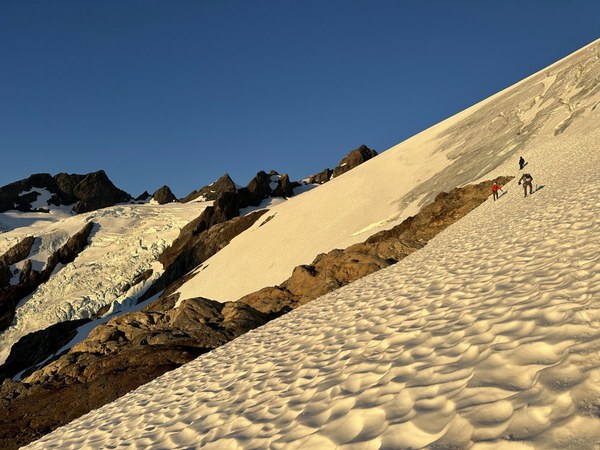 - Snow Dome was the highest objective hazard on the route. In the morning we did a low traverse across very steep and runout snow. Recommend protecting with pickets. In the afternoon we traveled higher but encountered a roughly 200ft long descending traverse on slushy blue ice. Recommend protecting with ice screws. Neither was great. Pick your poison.