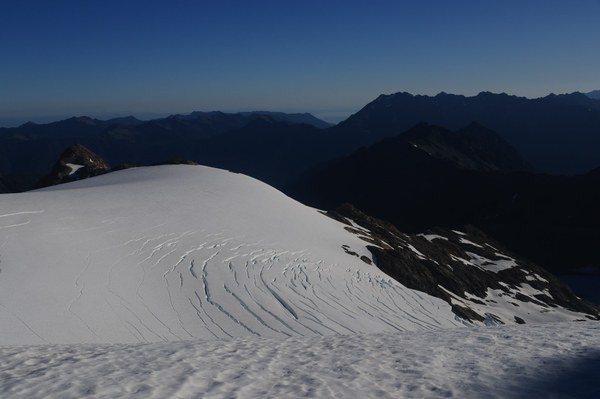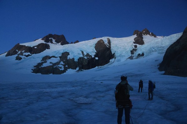 sunrise begins The path up to the summit is straightforward. Approach the ice fall and cut climbers' right up through the rocks and eventually onto Snow Dome. There is plenty of running water up to this point. This might be your last chance to fill up.