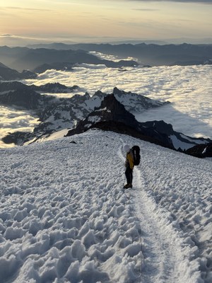 It was about 3:00 am when we left Muir. The rangers had told us that the current route features a 25 ft snow bridge on Ingraham Flats, so our primary goal was to not die on it. We based our turnaround point on getting back to the downhill-side of that snow bridge before noon. Crossing the Ingraham Flats (and snow bridge) was pretty uneventful, but there was some new serac fall up above from the ice box. The ascension up DC is nearly snow free so please, for the love of all that is sacred, take off your crampons here...especially on the way down (we did not because we're silly geese, and silly geese don't shed their talons). Somewhere along the DC we ran into our Muir friends again and shared a couple laughs. It was here that one of them said "You guys really just raw dogged that plywood floor [in the public shelter]"
