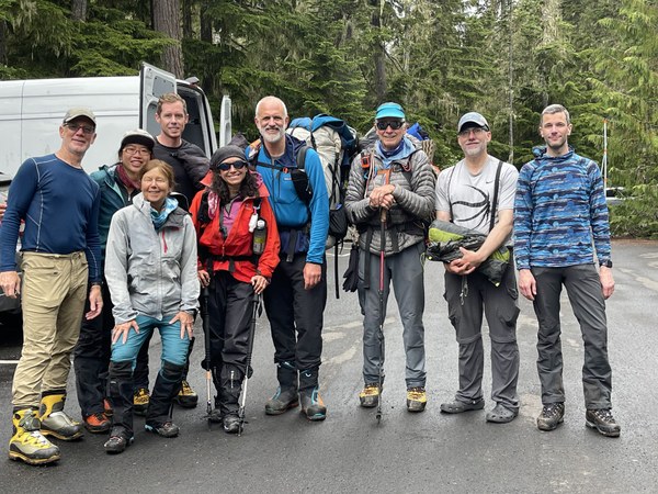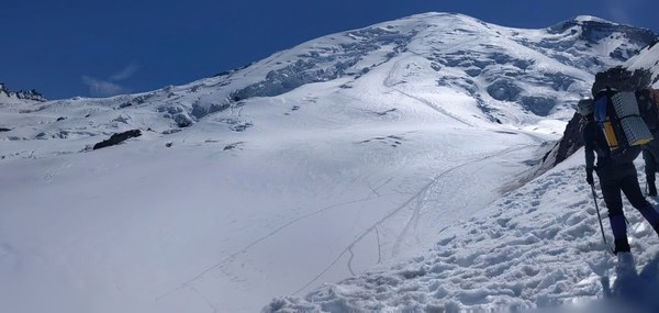 We routed fairly significantly to climber's right to cross the bergschrund and onto the saddle and then left back to Columbia Crest. 9 hours up.