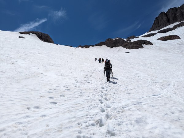 Glacier Basin to Inter Glacier was mixed trail and snow. Some melting snow bridges worth paying attention to here, especially at the moraine-snow interface where water undercuts the snow. The Inter Glacier had three small cracks developing that were easily stepped over.